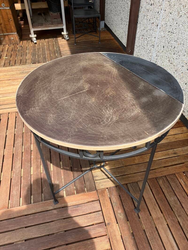 Met gekregen overschotten van parket hebben we een smeedijzeren tafel met 4 bijhorende stoelen bekleed. Wat epoxy erover (eerste maal dat we dit gebruiken) en tataaaa, dit is het resultaat (en een paar tussenstappen)