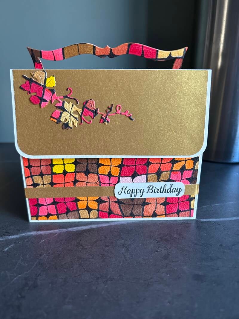 Deze "handtas" kaart werd gemaakt op aanvraag. De gekleurde delen zijn zelfgetekende tangles en verwerkt met goudpapier. Model gevonden op Pinterest.